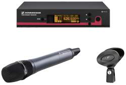 Wireless dynamic cardioid handheld microphone with MD845 capsule and EM 100 receiver.